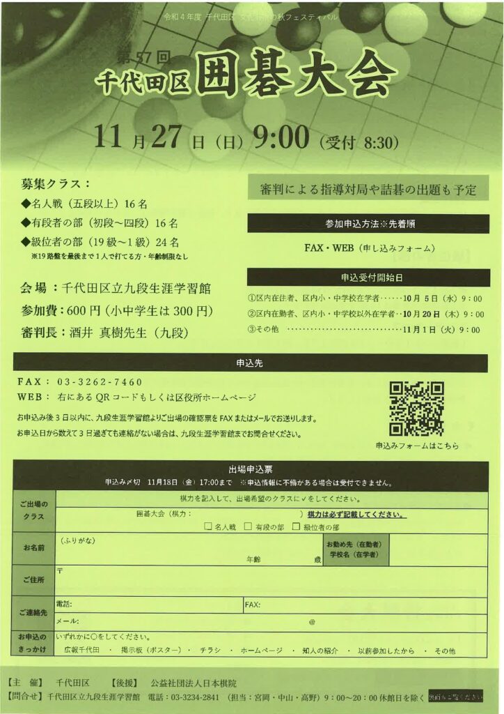 2022年10月7日 お知らせ・イベント 一部, 二部, 囲碁大会, 将棋大会, 小中学生の部, 総平手戦 [イベント]将棋大会参加者募集中 千代田区将棋大会が11月26日に開催されます! 小学生・中学生の部もありますので、お子さんから大人まで楽しめるトーナメント方式の大会となっています。我こそは!と思う方、新しい人たちとの対局を求めている方、ぜひ参加されてみてはいかがですか? 囲碁大会も11月27日開催予定で参加者募集中とのこと!級位者、有段者、名人戦など募集されています。