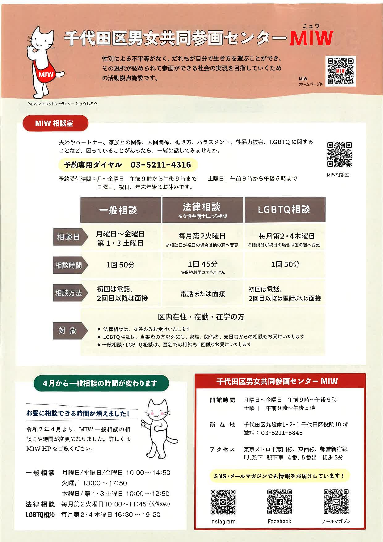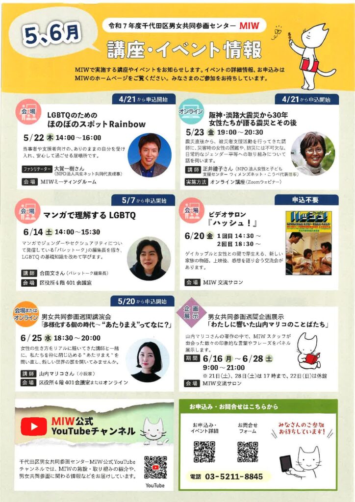 2025年4月23日 お知らせ・イベント MIW, 千代田区男女共同参画センター, 講座・イベント 千代田区男女共同参画センターから、5月、6月の講座・イベント情報のお知らせです イベントの詳細情報やお申込みは、MIWのホームページを御覧ください。 https://miw.city.chiyoda.lg.jp/