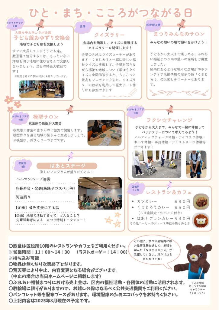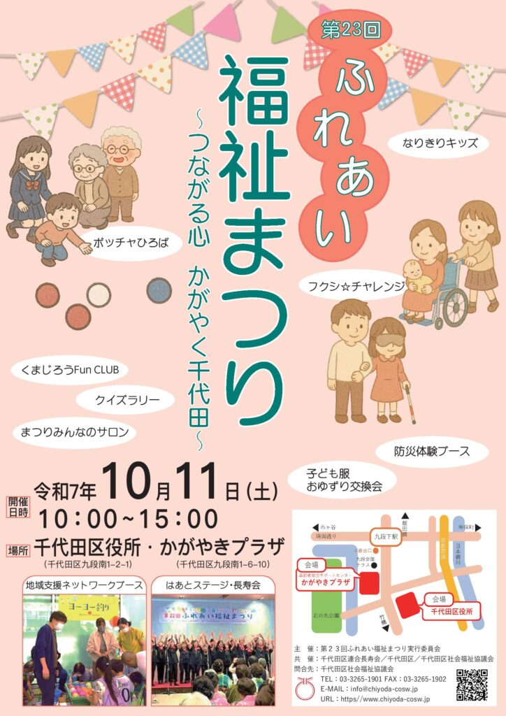 2025年9月30日 お知らせ・イベント 10月11日, かがやきプラザ, ふれあい福祉まつり, 千代田区役所 第23回 ふれあい福祉まつり ~つながる心 かがやく千代田~ 第23回 ふれあい福祉まつり ~つながる心 かがやく千代田~ 場所:千代田区役所/かがやきプラザ 日付 2025年10月11日(土)10:00~15:00 フクシチャレンジ、防災体験ブース、子ども服おゆずり交換会、クイズラリーや楽しいプログラムが盛りだくさんのはあとステージなど。 どなたがいらしても楽しめる毎年恒例の催しとなっています。 ふれあい福祉まつりにおける売上金は、区内の福祉活動・各団体の活動に活用されます。ぜひお誘いあわせのうえお越しください。