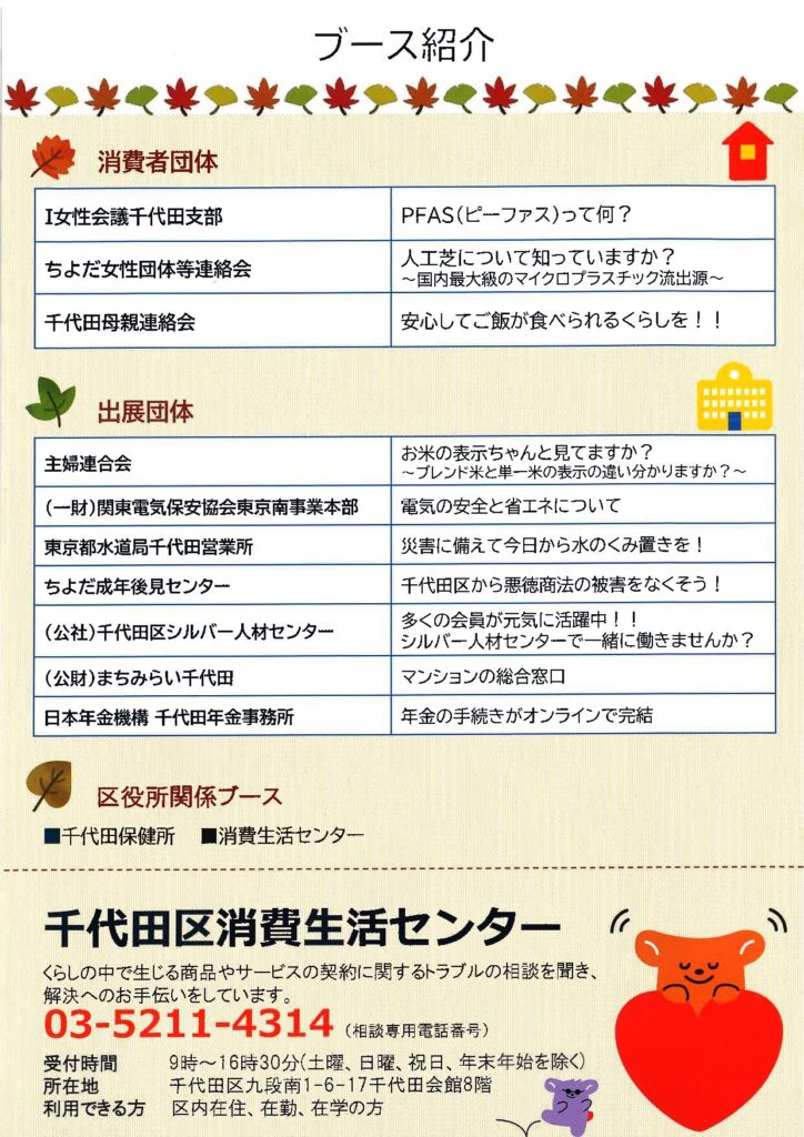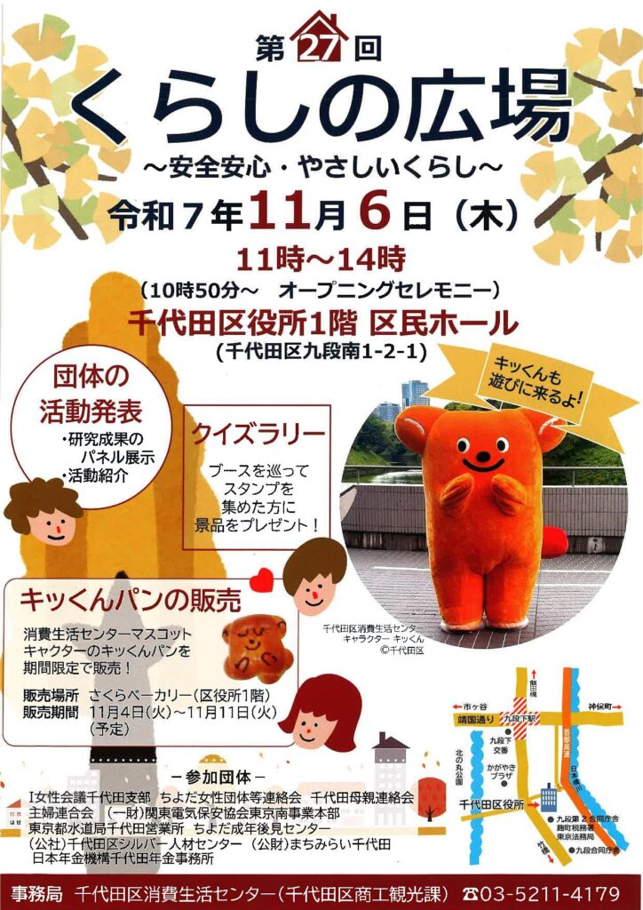2025年10月9日 お知らせ・イベント 第27回くらしの広場~安全安心・やさしいくらし~開催 日時 令和7年11月6日(木)午前11時~午後2時 (午前10時50分~オープニングセレモニー) 場所 区役所1階区民ホール 主な内容 1.消費生活に関連する団体の活動発表 2.クイズラリー 3.各団体によるブース出展 4.キッくんパンの販売 事務局 千代田区消費生活センター(千代田区商工観光課)03-5211-4179