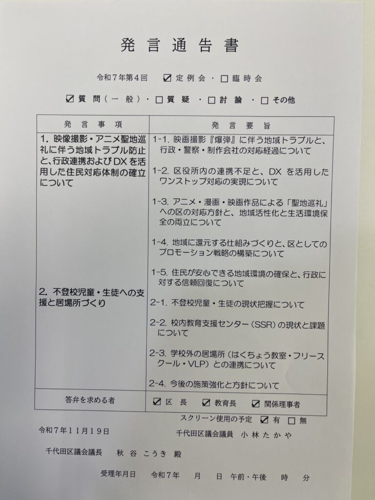 11月27日、令和7年第4回千代田区議会定例会にて一般質問を行います