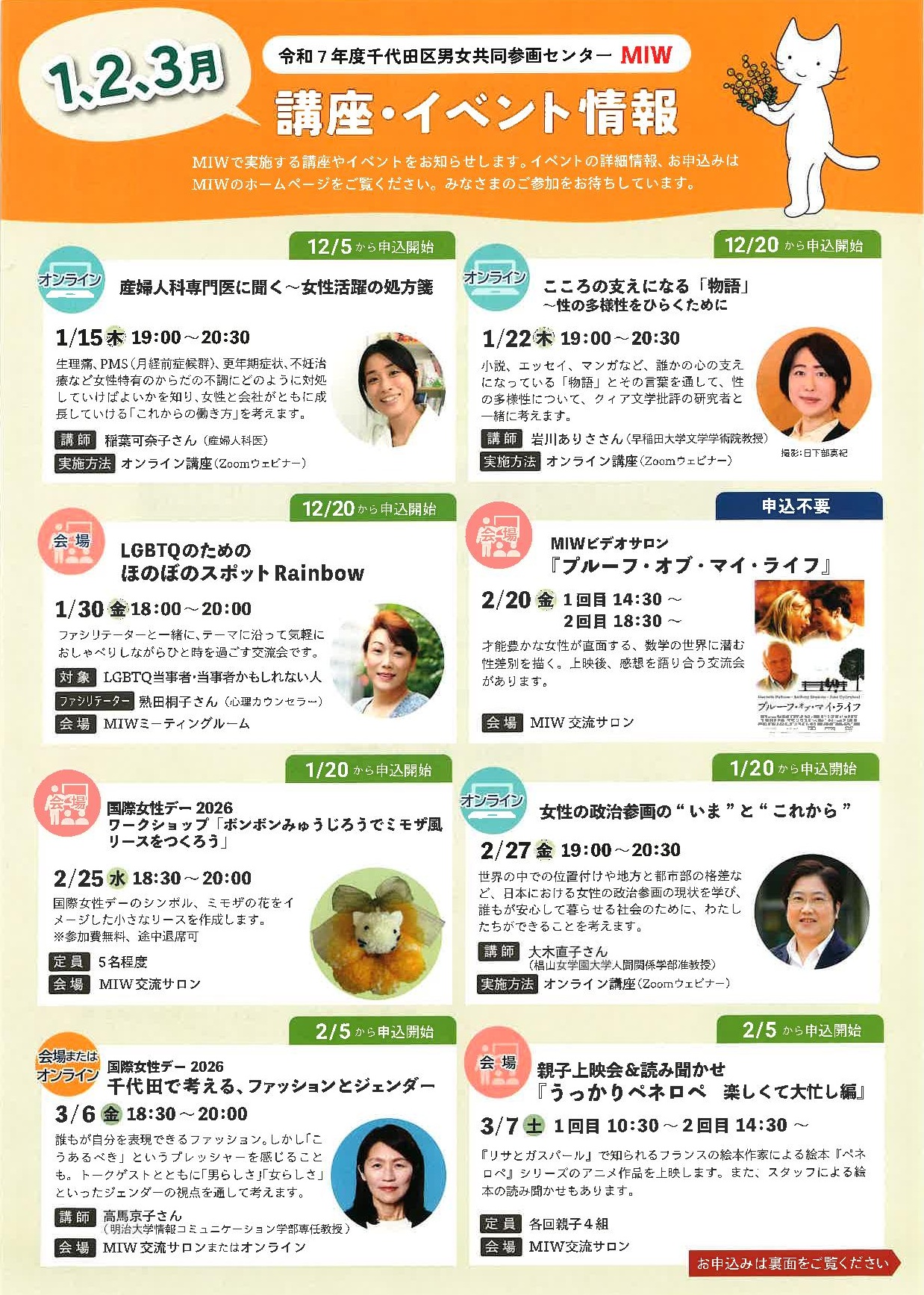 千代田区男女共同参画センターMIWで、令和7年度1月~3月の講座・イベント情報が公開されています。オンラインの学びから会場開催の交流企画まで、多彩なプログラムが並んでいて、ジェンダーや暮らし、からだのことなどを身近なテーマとして考えるきっかけになりそうです。