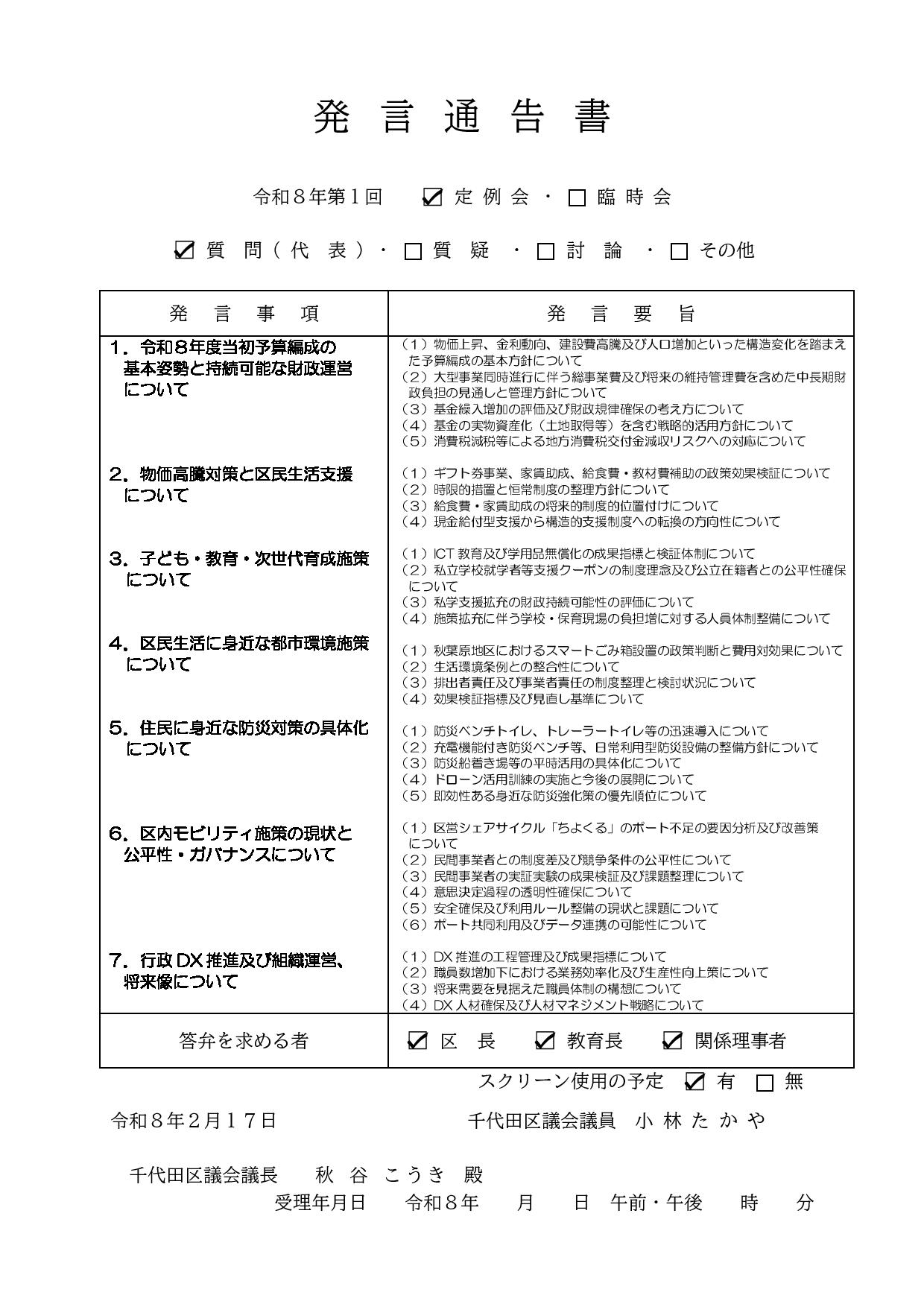 2月25日、令和8年第1回千代田区議会定例会にて代表質問を行います