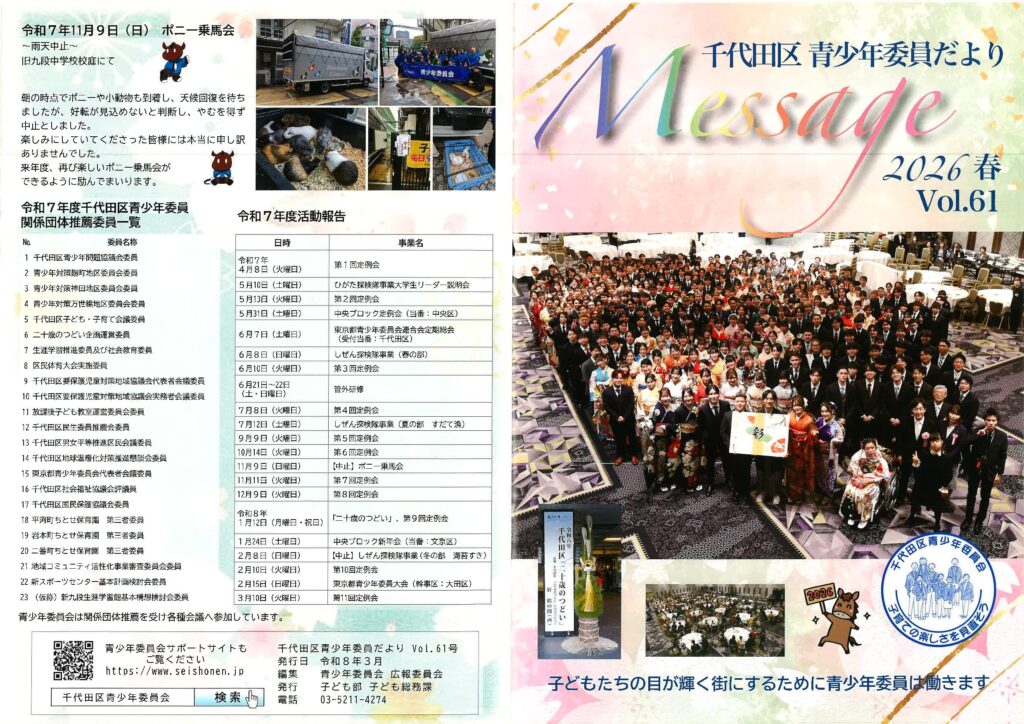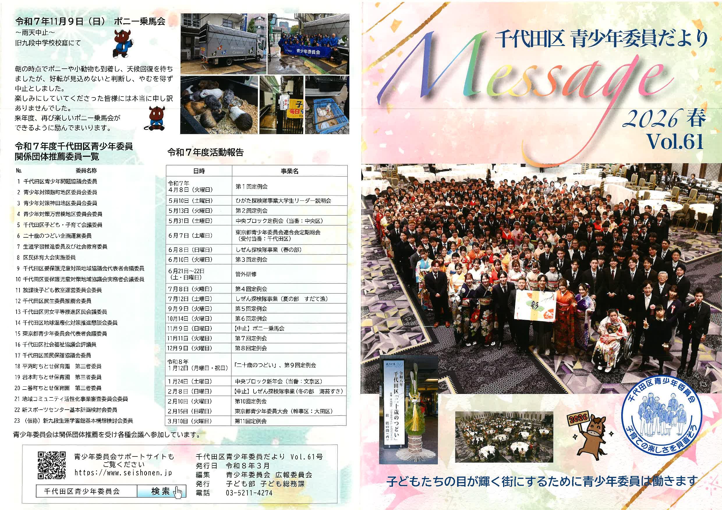 2026年3月10日 お知らせ・イベント 2026春, Message, 千代田区, 青少年委員だより 広報誌「Message」が発行されました 毎年2回発行されているしている広報誌「Message」の最新号が発行されました。 区役所や区の施設にて配布していますので、ぜひお手に取ってご一読ください。