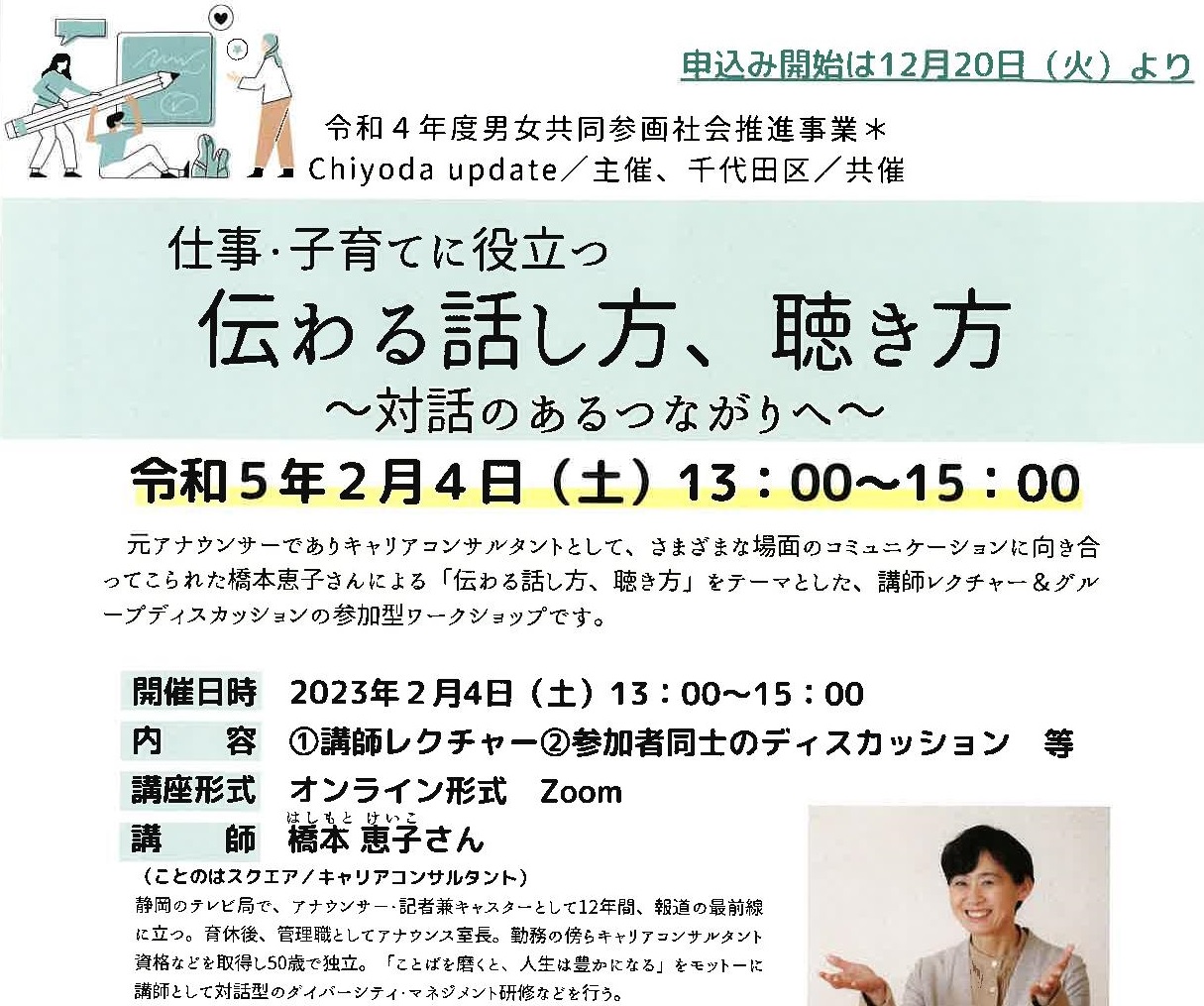 2022年12月20日 2月4日, MIW, Zoomミーテング, オンライン形式, ワークショップ, 元アナウンサー, 橋本恵子さん [ワークショップ]仕事・子育てに役立つ伝わる話し方、聴き方 元アナウンサーでありキャリアコンサルタントとして、… Read More